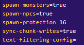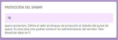 3. Una vez abierto el archivo server.properties buscamos el valor spawn-protection que por defecto tiene un valor de 16 y se reemplaza por un valor igual a 0. Este valor representa el radio de protección en el spawn medido en bloques.