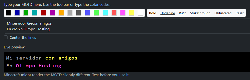 En ella podremos escribir el nombre de nuestro servidor, añadirle colores, una segunda línea. Además podremos previsualizar como quedara en la lista de servidores una vez lo pasemos a nuestro servidor de minecraft.
