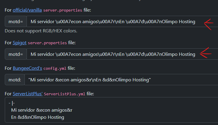 Al terminar de personalizar nuestro nombre copiamos el texto del recuadro de Spigot si nuestro servidor instalado es Paper u official/vanilla si nuestro servidor es Forge y lo pegamos en el apartado motd del archivo server.properties