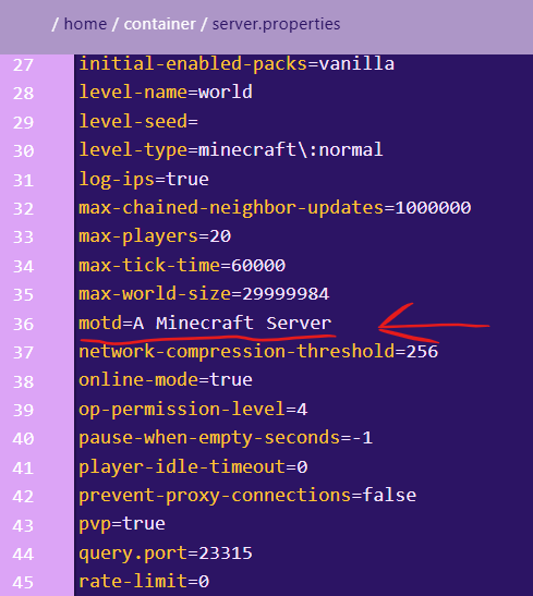 Accedemos al archivo y dentro buscamos el termino motd, por defecto se vera así motd=A Minecraft Server